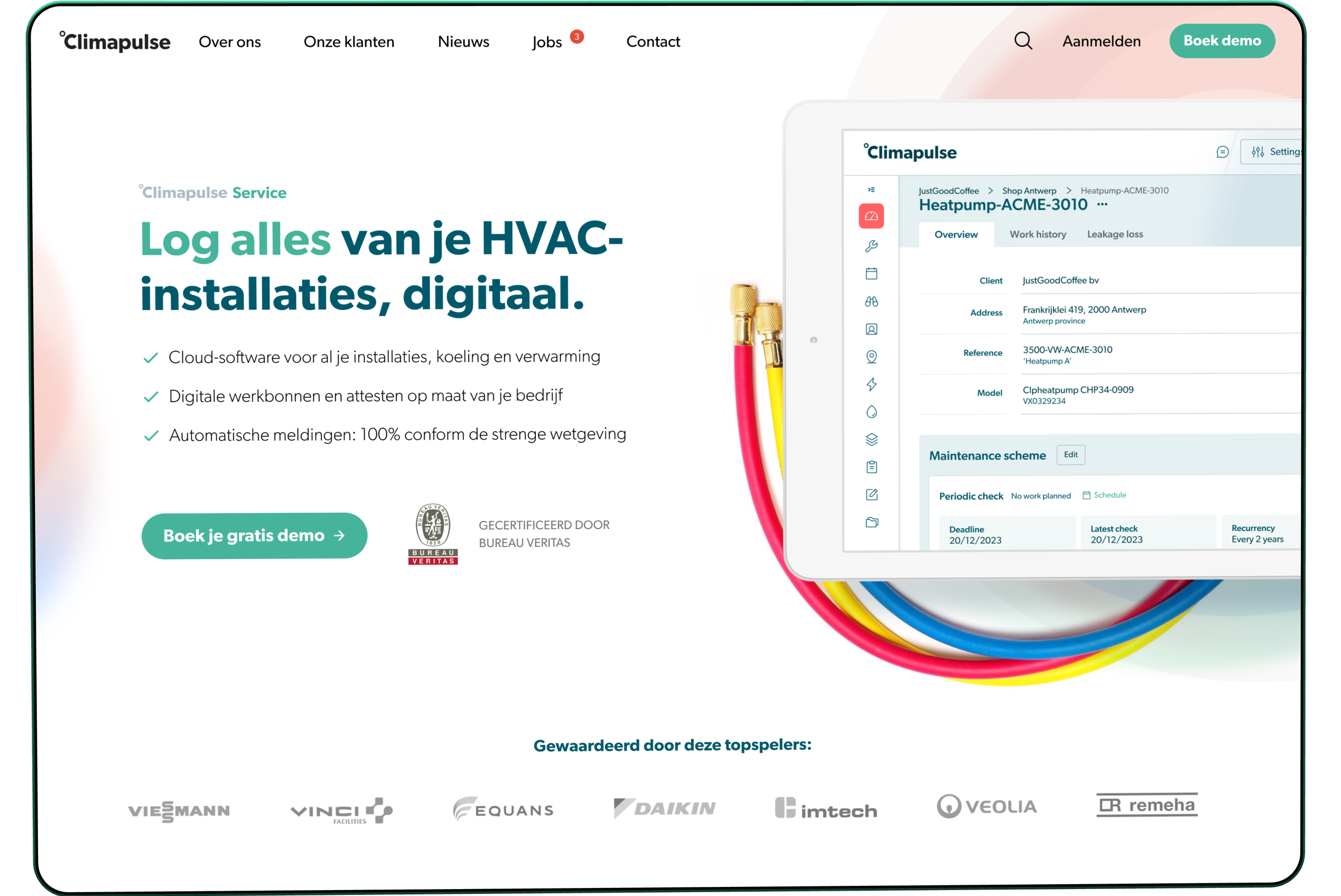 ‘Compliancy-software voor de HVAC-sector’ is niet meteen een elevatorpitch om de aandacht te trekken van een UX-designer. Maar totaal onterecht, zo bleek. De software is weliswaar ontstaan vanuit een Europese (geeuw) verordening; vandaag wordt deze tool gebruikt door meer dan 30% van de koeltechniekers om hun werkbonnen op te maken en zo - indirect - hun logboeken volledig en conform te houden volgens de complexe regelgeving. Bij Climapulse leer je hoe complex koeltechniek is en besef je dat je een vette kluif hebt aan het bedenken van een tool die hen kan begeleiden in die complexe processen.